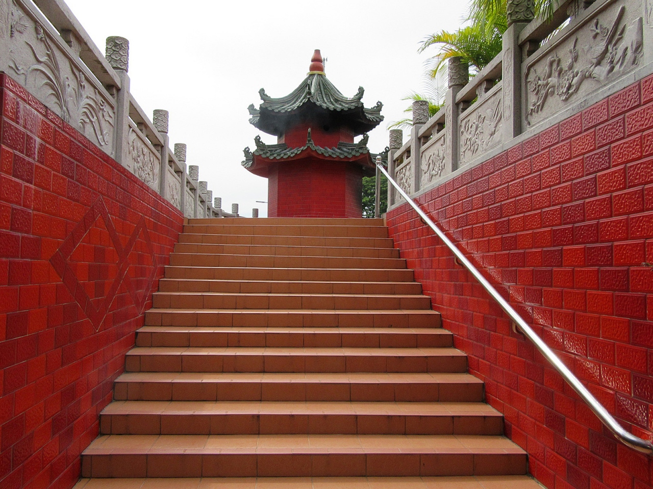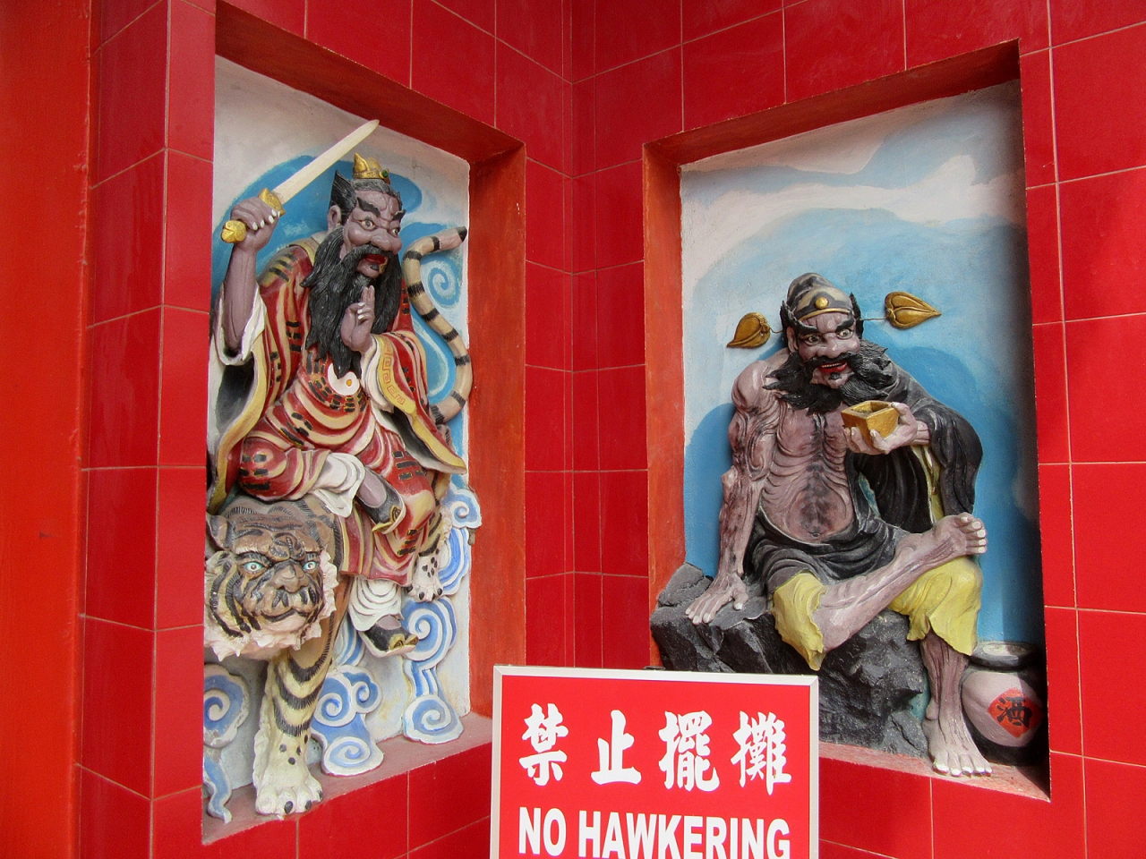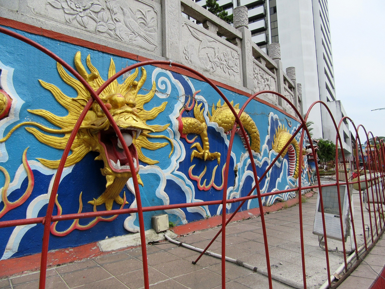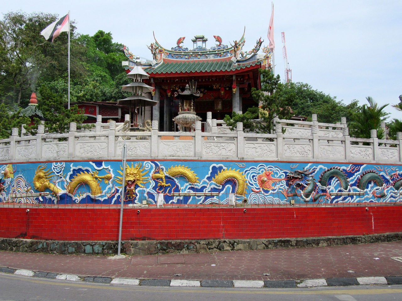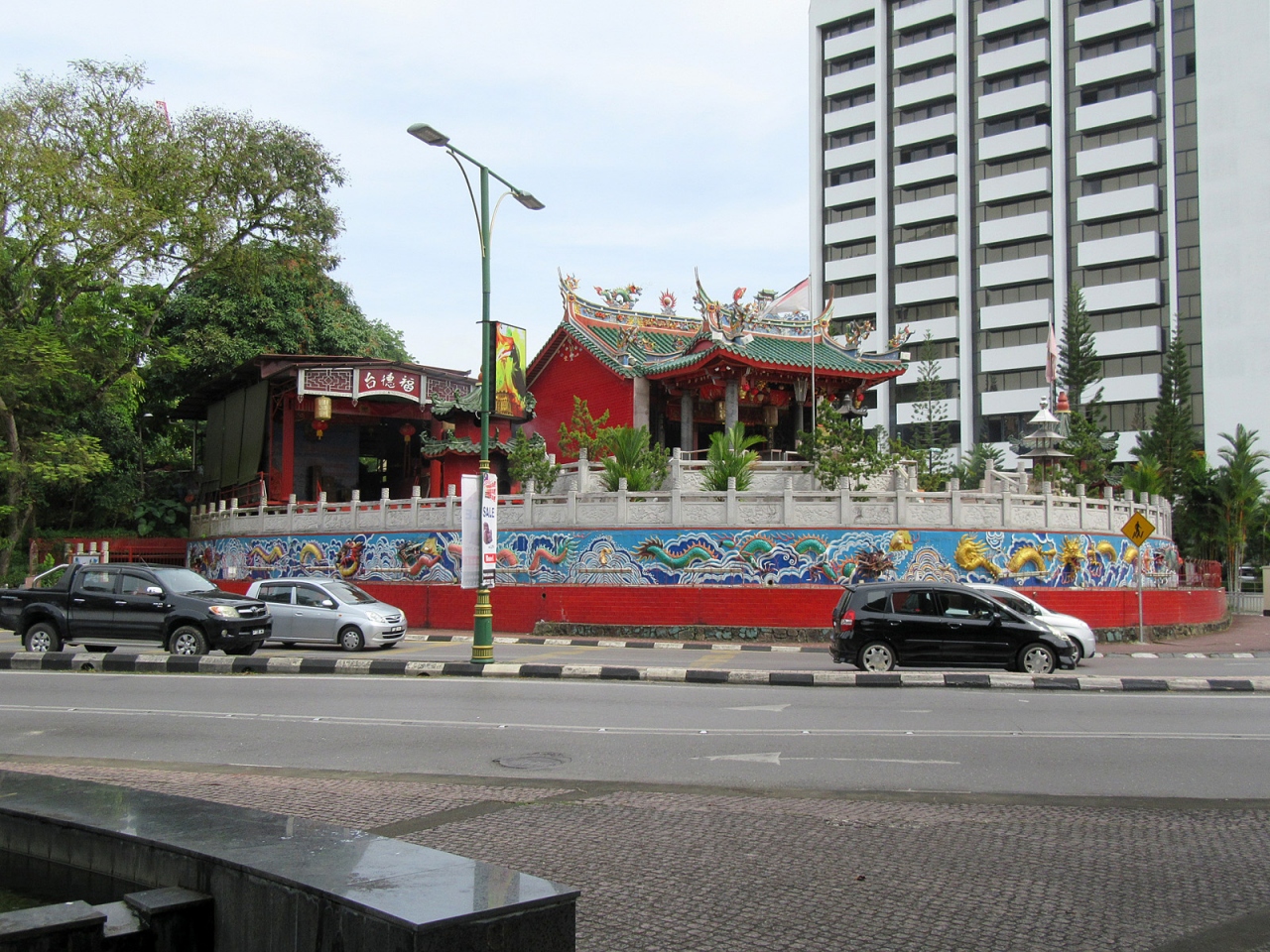 「華人歴史文物館」と道路を挟んで向かい合って建てられている華やかな建物が「大伯公」、クチンで最も古い中国寺院とのことです。ただ、日本ではしばしば中国寺院と呼ばれますが、もちろん仏教ではなく、神々を祀る場所ですから、日本でいえば神社に近いものですね。祀られているのは福徳正神という神様ということでした。華人の人が黄金に見立てた金色の紙を火にくべて燃やしている姿はもちろん、その外壁部分のチープさにも中国らしさを感じることができました。