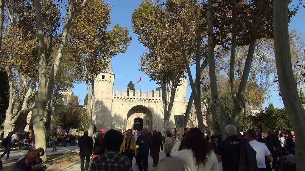 トプカプ宮殿の第1庭園と第2庭園を隔てる門で、同時に、有料エリアと無料エリアを隔てる門です。ゲートはここしかないのでしょう。全ての入場者はここを通るわけで、私達が行ったときも「人・人・人」という感じでした。ここに来るまでの第1庭園は木々の茂った雰囲気のある通路になっていて、そこを通り抜けると視界にはいるのがこの門です。とんがり屋根2つと中央に旗が一つ翻っていて、いやが上にも気分が盛り上がってきます。