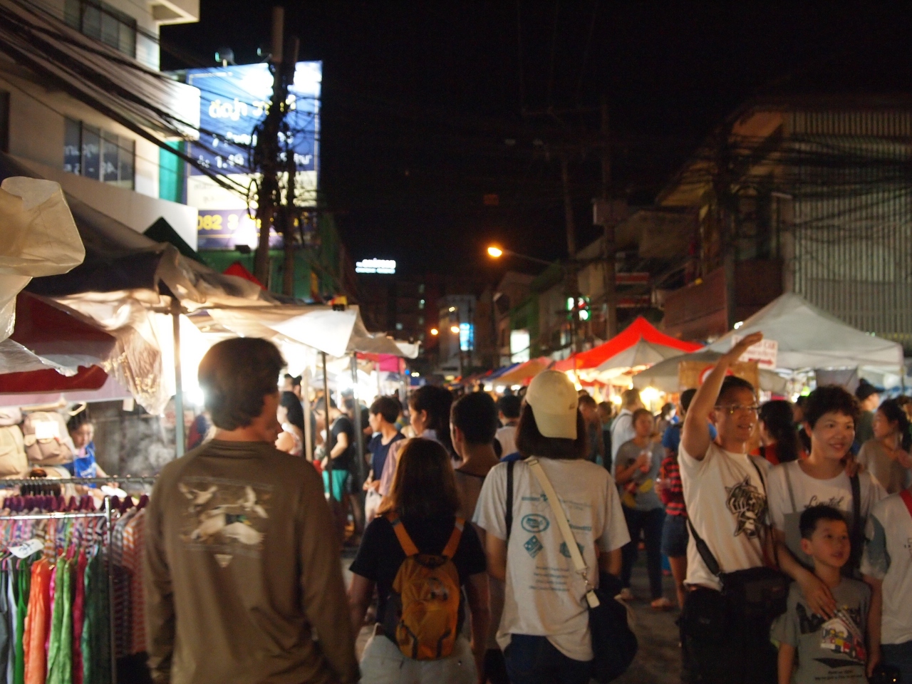 土曜の夜、チェンマイ門から南側にできるナイトマーケットに行ってみました。ものすごい人出で、なかなか前に進まないぐらいです。狭い通りの真ん中ではストリートミュージシャンが演奏していたり、結構楽しめました。屋台は土産物や食べ物がほとんどで、安いとは言えませんが、ごった煮のような賑わいのなかでの買い食いもいいものです。