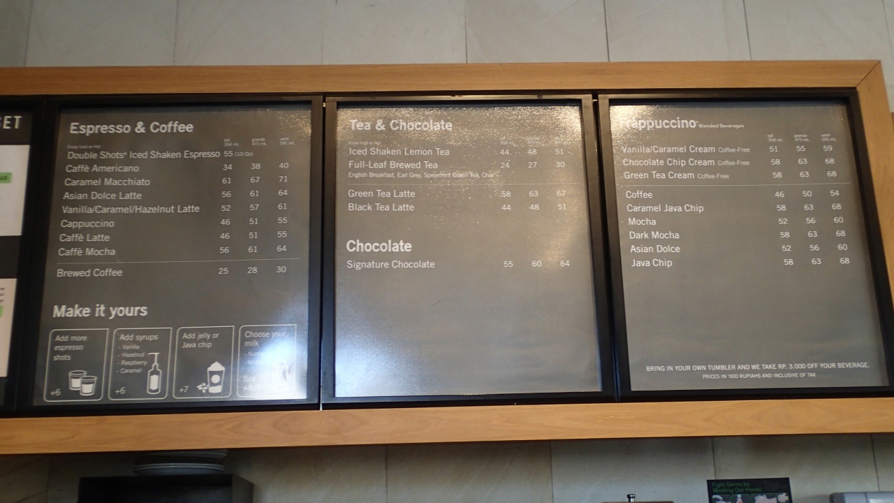 ちなみに、お値段は、コーヒーRp.25K、カプチーノ/カフェラテがRp.46K,フラペチーノはRp.46K-58K(いずれもトールサイズ)といったところです。