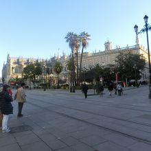 路面電車が通る広い通りでヒラルダの塔が良く見えます
