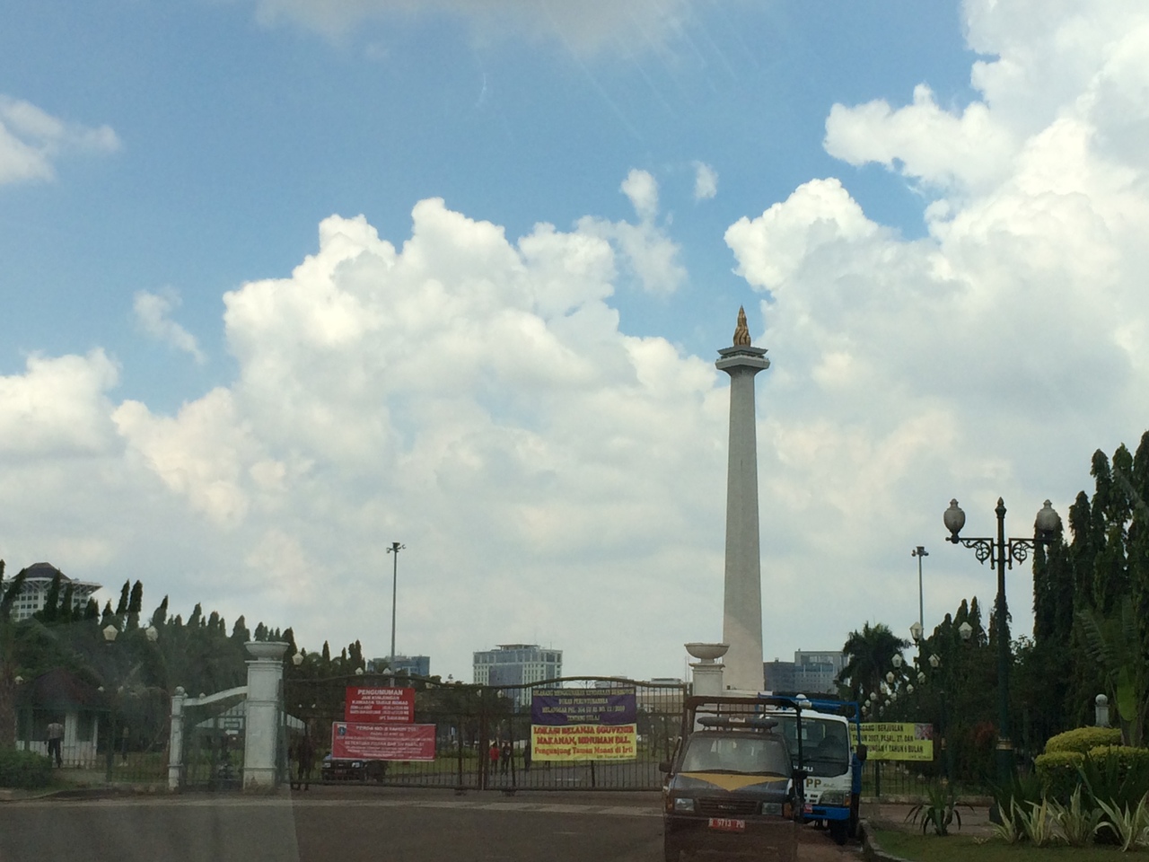 インドネシアの独立記念塔。目抜き通りクニンガン通りの突き当たり大統領官邸の近くにあります。金の炎がモチーフの印象的な建造物です。周りは公園になっており、塔の中は歴史の博物館になっています。時間によっては入場が長蛇の列になっていますので注意が必要です。