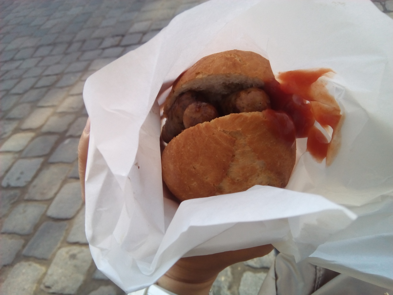 パンにニュルンベルク3本入ったヴルストブレートヒェンが1つ2.5€なのですが、店に一人で入って、これがほしいと指さしたら、3個か2個かと聞かれて、3本入りのことかと思って3と言ったら、3個9本にされて、7.5€と言われました。断れずに食べきれないと言ったら、店員さんは苦笑い。わかっててはめられたんじゃないかとちょっと思っちゃいました。意地で9本食べましたけど。