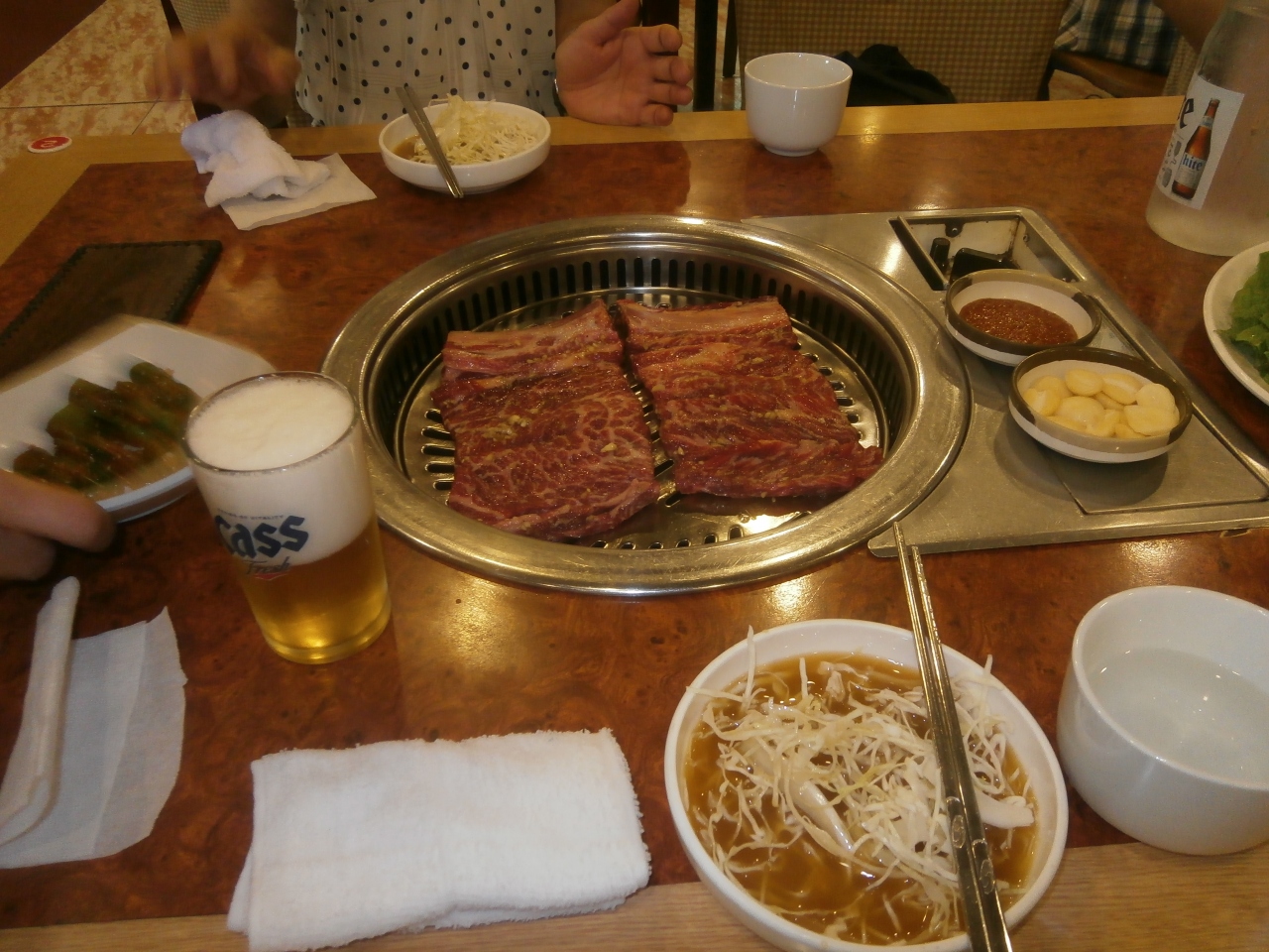 水原駅前の観光案内所で勧められたランチ・スポット。妻と二人で水原華城遺跡を散策し、途中で見かけた煙突をめざしながら、徒歩で訪店した。昼時の繁忙時間でありお店はほぼ満席に近い状況だった。店員さんに空席に案内され、定食と冷麺、ビールを注文。多少時間がかかったが食材が運ばれ、「骨付きカルビ」の大きさにビックリ。ビールを呑みながら店員さんがハサミで切り落とすカルビを食したが、香ばしく柔らかく超美味であった。韓国ならではの副菜も多くお腹いっぱいになった。定食2人前、冷麺1人前、ビール1本で50,000ウオン(5,000円弱程度)のお勘定。納得のいくランチでした。マシッソヨ!