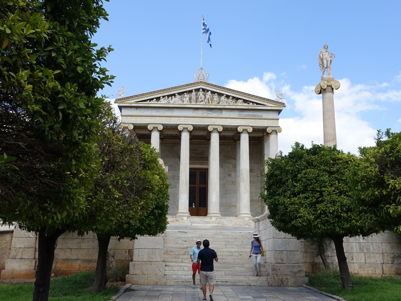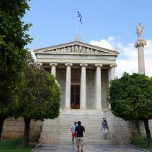 考古学博物館を見学した後「パネピスティミウ通り」を通ってシンタグマ広場に戻りました。この通りには、「国立図書館」「アテネ大学」とともに、アカデミーが並んでおり、そのいずれもが素晴らしい建築物です。アカデミーの前には緑も配置されていて、建物の風格に花を添えているように感じます。これらの建物が堂々と並んでいる様子は、ギリシアの首都・アテネを象徴するような見事な光景でした。