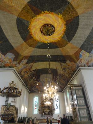 大聖堂はオスロ駅のすぐそばです。オスロ駅から大聖堂に行く場合は、1階のカフェが並んでいるところにある階段をのぼると大聖堂の目の前に出ることができます。大聖堂は無料で入れますが、天井にある絵がきれいでした。