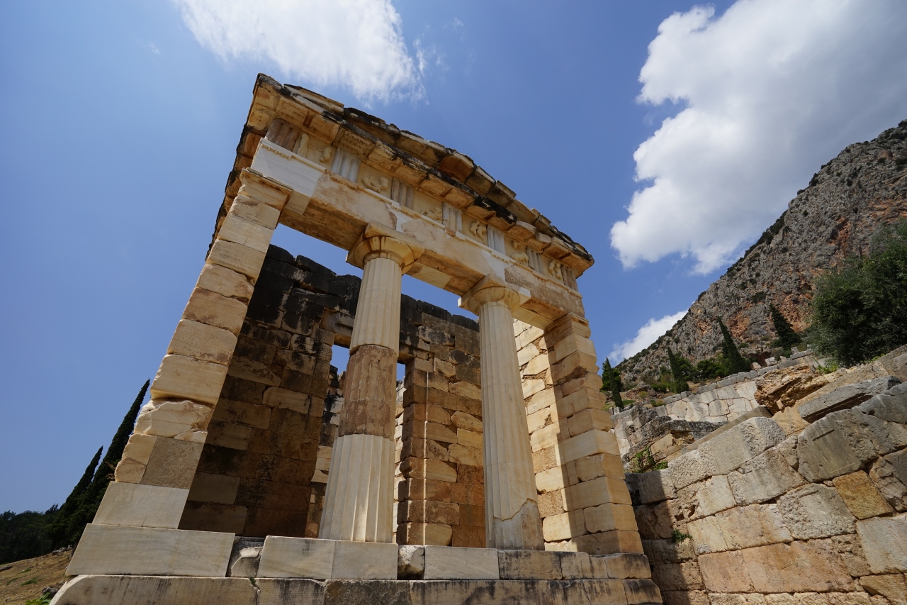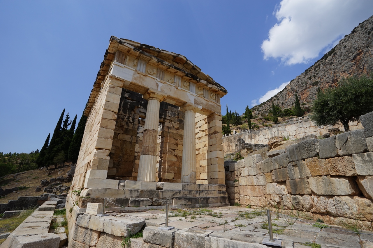 デルフィの遺跡にあるアテネ人の宝庫ですが、アテネがマラトンの戦いに勝利した記念(紀元前5世紀)に建てた宝庫です。この現在の建物は20世紀になって復元されたもの。