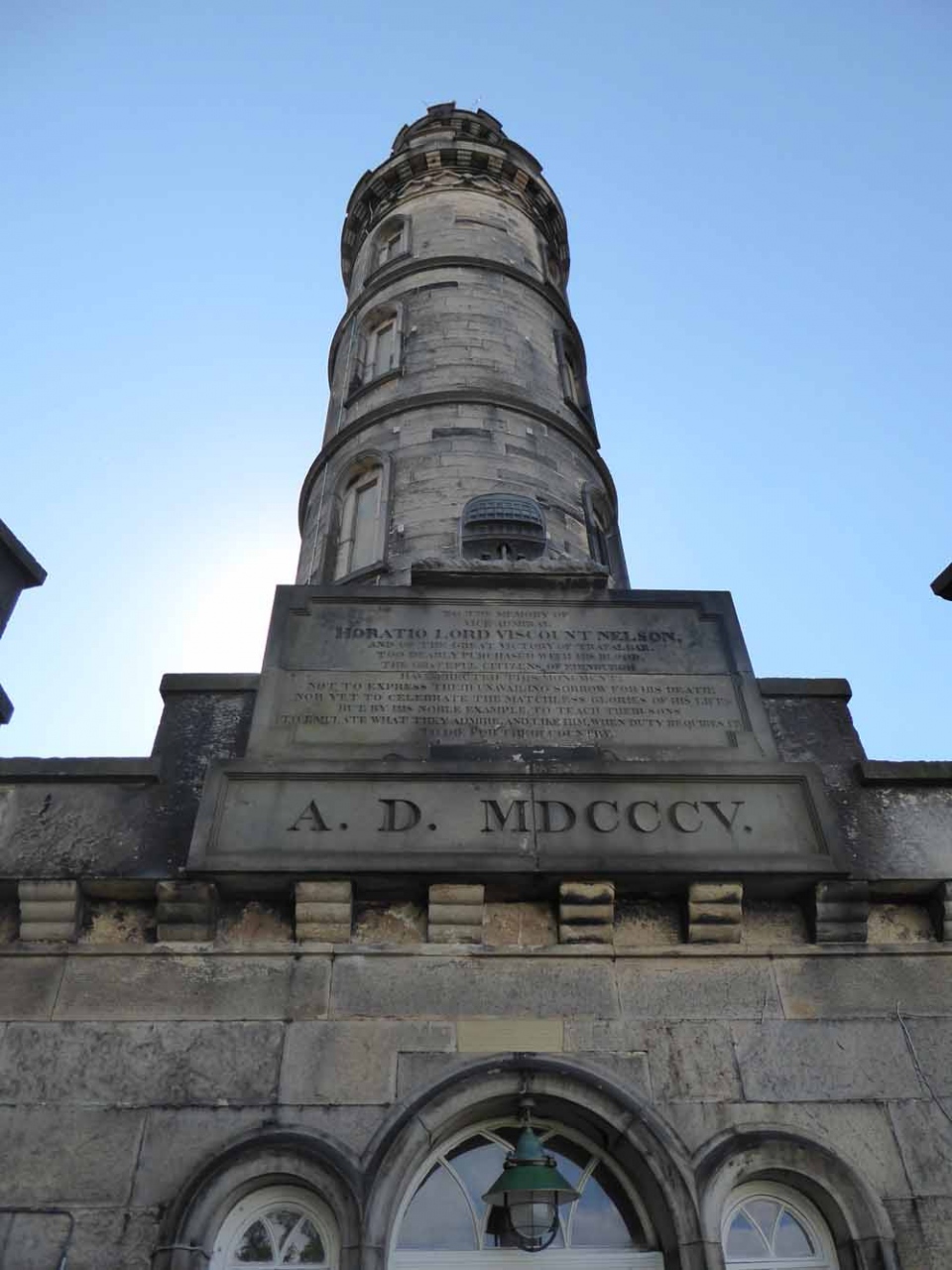 カールトンヒルでネルソン記念塔(The Nelson Monument)は目立っています。1805年のトラファルガー海戦でフランスとスペインの連合艦隊を破ったネルソン提督の業績を記念して建てられた塔で、高さは32mです。この塔は、1807-1815年に建設されたと説明されていました。塔には入場料を払って上ることができます。