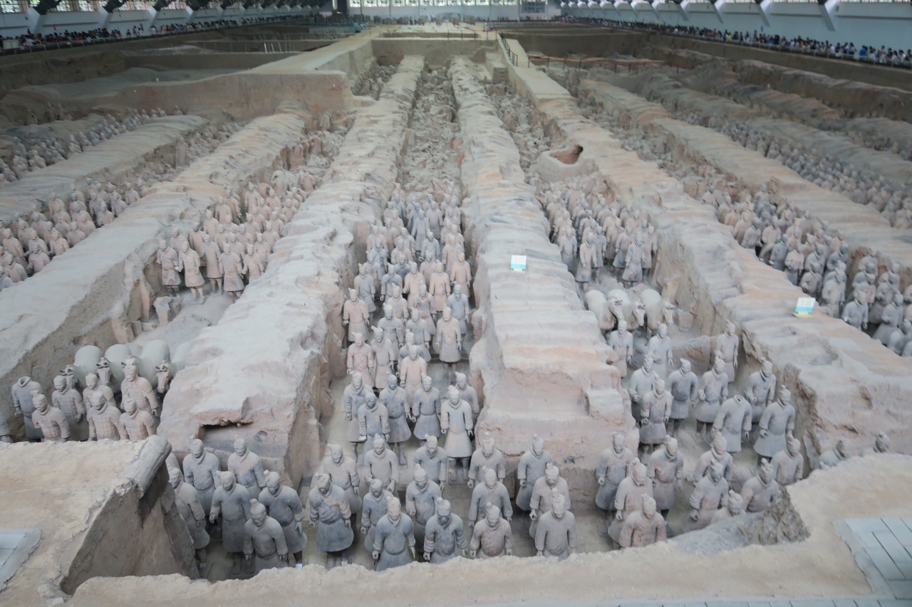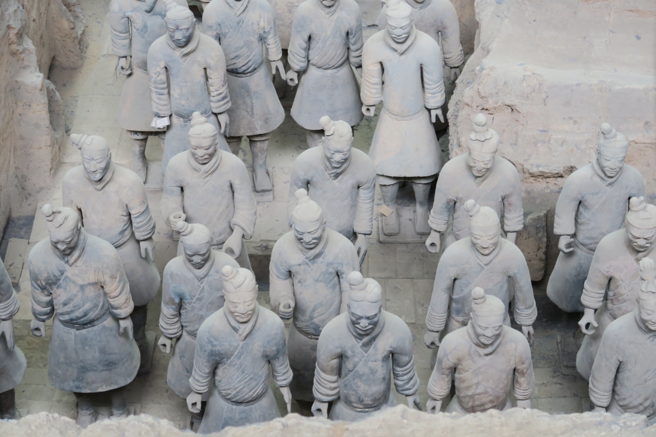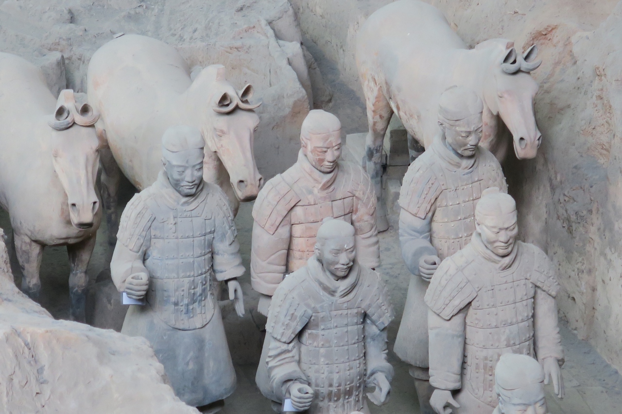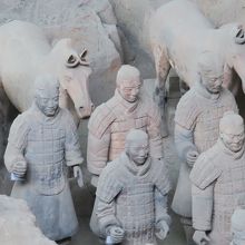 あこがれの兵馬俑を現地で、ゆっくりと見る事が出来ました。先ず、始皇帝陵を見学してから、シャトルバスで戻り、いよいよ兵馬俑見学へ。一号杭の左手にある映画場で先ず、スクリーンによる説明。(画像は良くありませんでした。)いよいよ、圧巻の一号杭へ。見学者も多いのですが、時間をかけて先頭に立ちます。すごいです。真下に兵馬俑がずらりと並んでいます。二号の馬車群もすごい。現在の技術では、発掘後に、彩色が維持できず、退色してしまう為に、新たな発掘はストップしているとの事。途中、ミュージアムショップで、ミニュチアの置物を買いました。(兵馬俑博物館の刻印入り)。三号から、最後に銅馬車の展示館まで、圧巻の展示物でした。夕方に、一号杭によると空いていて、しみじみ眺める事が出来ました。滞在期間中に、もう一度あらためて見学に行きました。大満足でした。