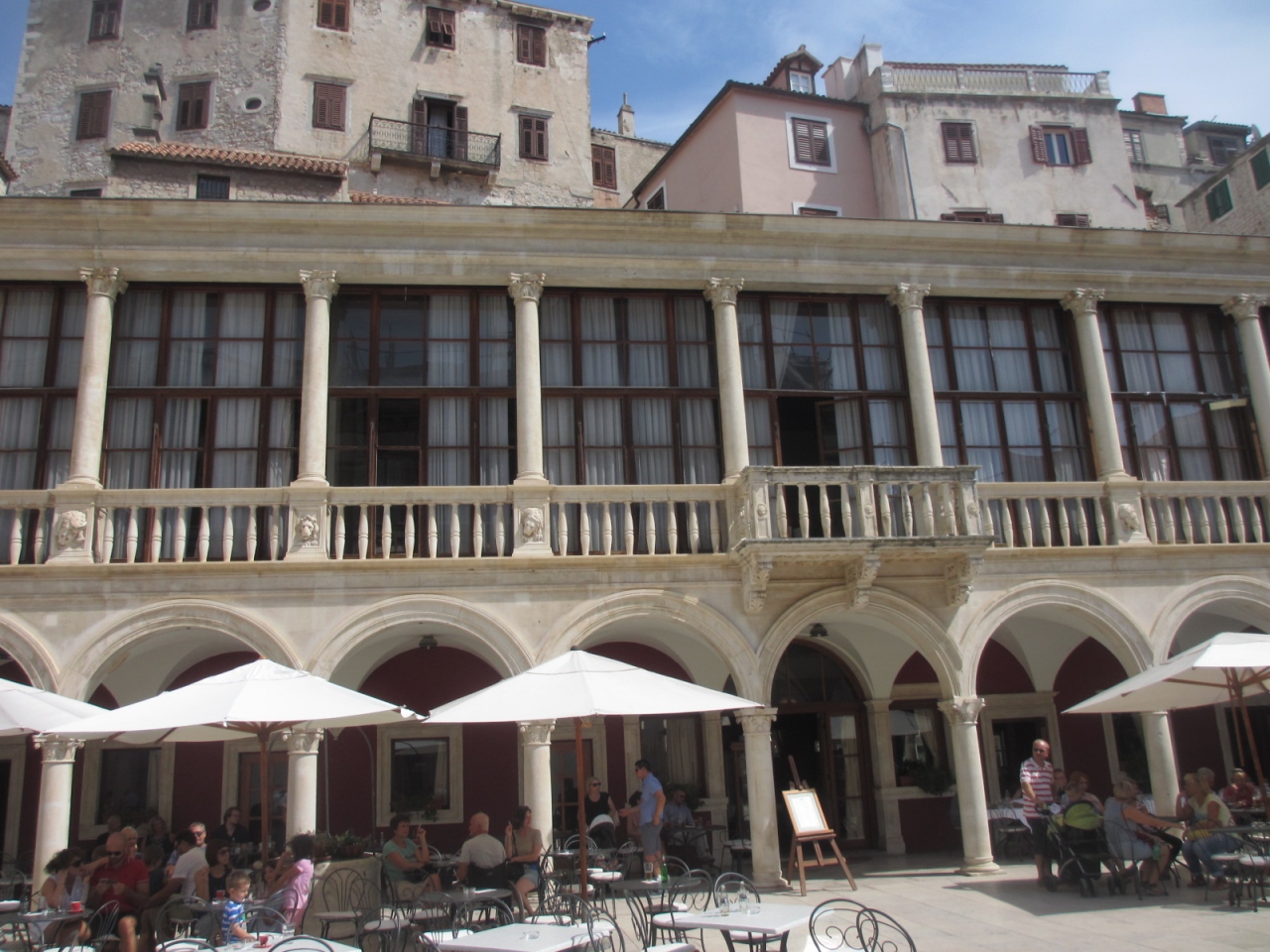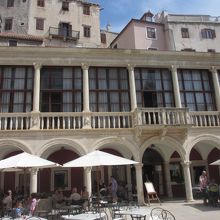 シベニク旧市街の中心部にあります。聖ヤコブ大聖堂の北東側にあります。1階のアーチ構造や2階のバルコニーなど見ごたえのある美しい建物です。すぐ前の部分はカフェの客席になっているのも雰囲気を出していました。