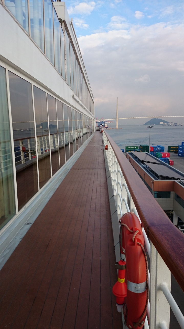クルーズ客船・コスタビクトリアで釜山から帰るときに写真を撮りました。釜山に入港する際にも通過してるハズですがその時は気づきませんでした。夜になり、イルミネーションがえぇかんじにキレイでしたよ。次に機会があれば、橋の上を走ってみたいと思います。