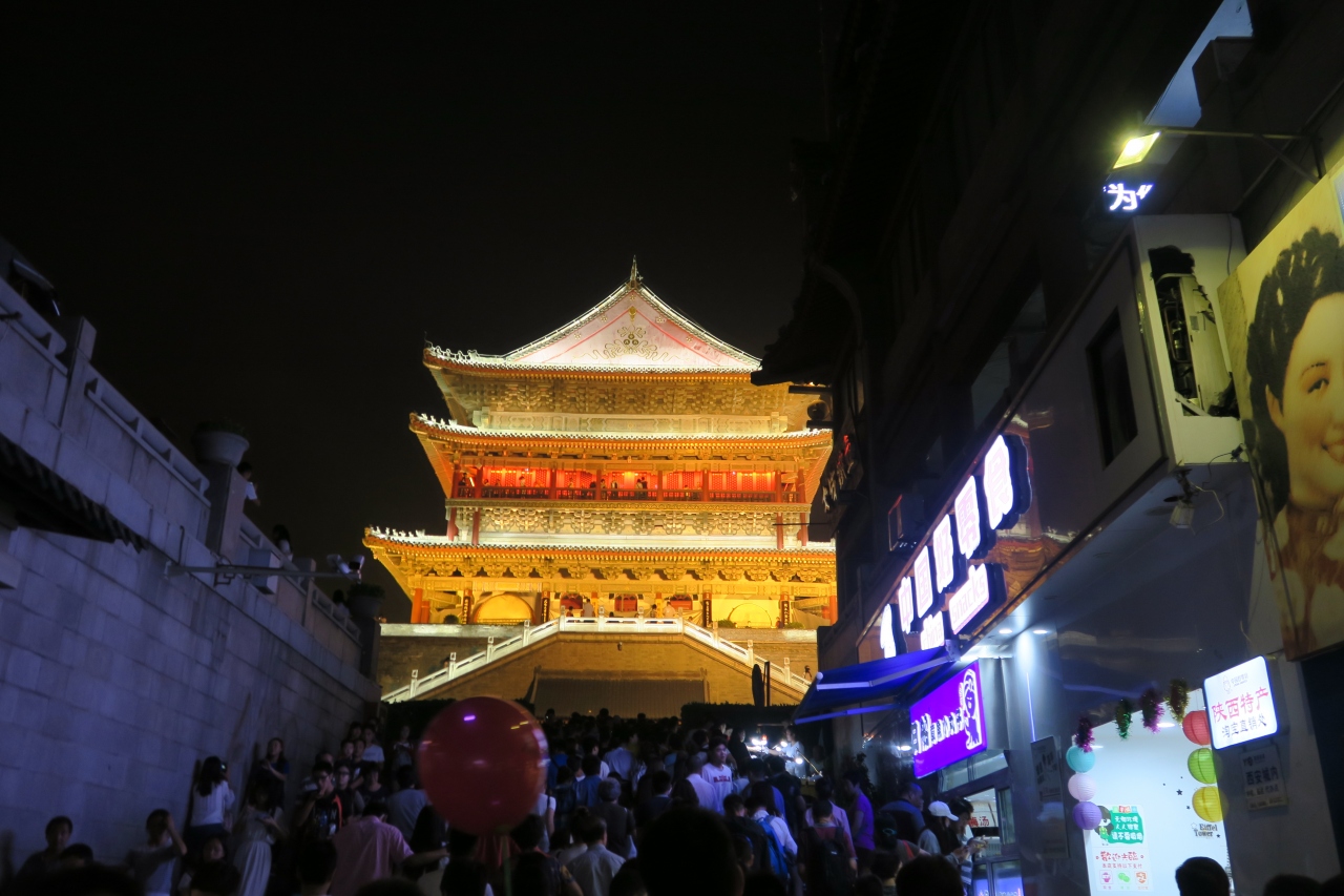近所のホテルに宿泊したので、毎晩のように鼓楼のライトアップを見ることが出来た。近くの鐘楼と同じような綺麗なライトアップで、西安の夜の忘れられない光景となった。回教街が近く、周辺の人混みは凄かった。有名店の徳発長、同盛祥(2回)、回教街と、毎晩のように周辺のお店で、晩御飯を採ることとなった。西安が歴史的な街であることを感じさせる一帯であった。