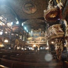 数少ないバスを逃し、1時間遅れで電車で到着。教会の建築当時に与えられた課題の中に「街の外壁の外に建てること」とあった通り、駅からは少し歩きます。とはいえそれほど大きい街ではないので15分少々。ゴシック調の門とカフェを抜けると緑に囲まれたメルヘンチックな、これまで見た教会とは違う佇まいが見えてきます。まずは外側を拝見しいざ中へ。始めに小さい部屋があり、ちょっとしたグッズとチケットを売っています。人がいなかったので2,3分待ち、チケットを買うと、出身を聞かれ、日本語表記の説明を渡されました(貸し出し)。写真撮影は自由です。大きく豪華だと聞いていましたが、本当にたくさんの制約の中よくこれだけのものが作れたなと感心します。制約があり前例がない難問を超えたからこそこういうクリエーティブが成されるのかもしれません。