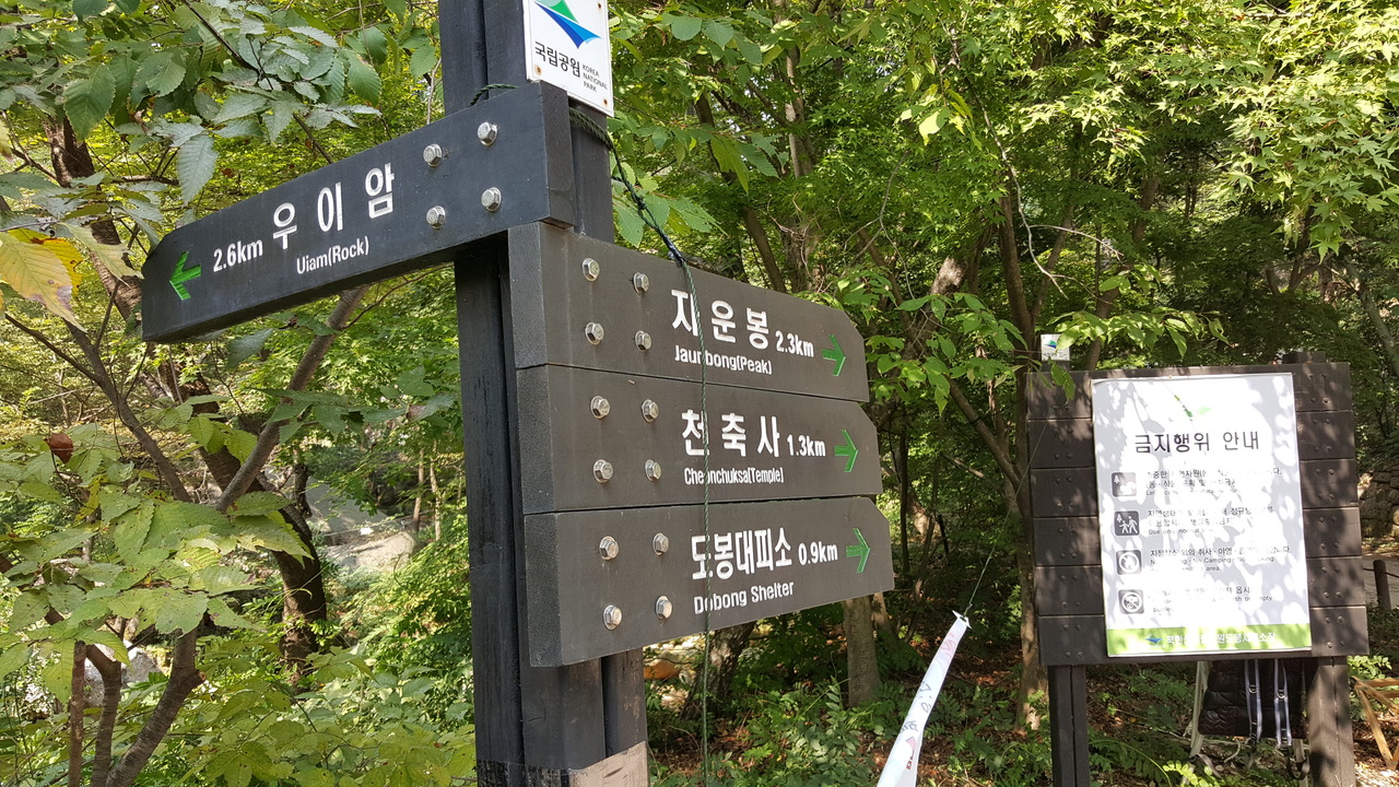 北漢山国立公園ですが、北漢山と道峰山がメインです。わたしは道峰山の方が交通の便がよく、行きやすいと思います。道峰山の方は地下鉄1号線でアクセスできます。登山道の道案内は残念ながら外国人にとっては分かりやすいとは言えませんが、登山客が多い山なので、問題ありません。主峰の頂上は険しく登ることは出来ませんが、低い山ながらにも、景色がとてもいいです。入山料はありません。