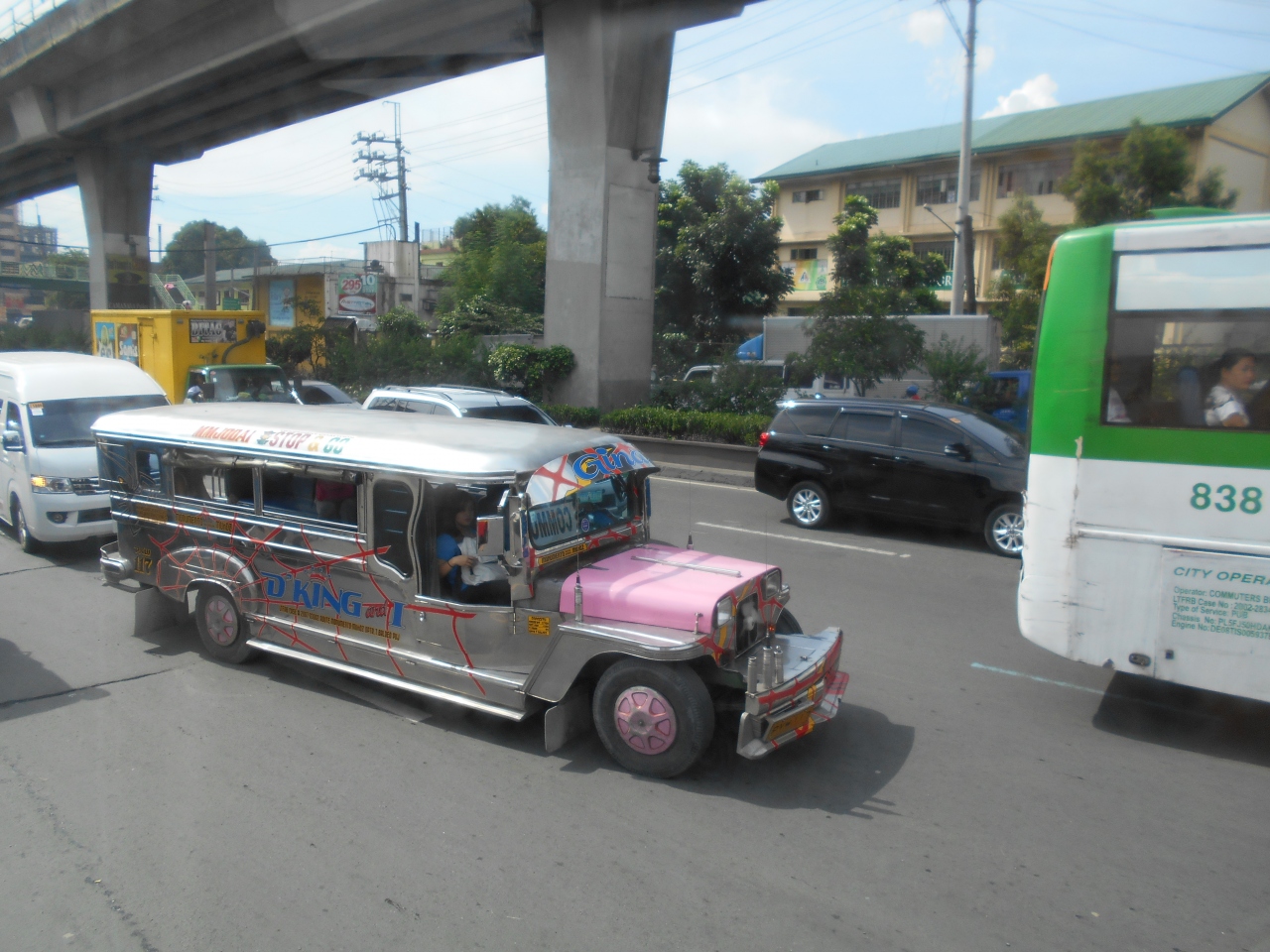 首都圏鉄道MRTに沿って走るジプニーに乗りました。交通量が多いし渋滞してるし蒸し暑いのに、ジプニーの後の客席には窓がないので結構つらい移動になりました。 後に座っているときは、前に座っている人に料金を渡すと、手渡しでおつりが戻ってきました。
