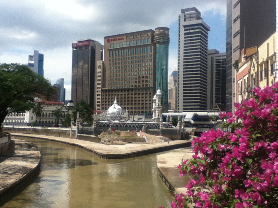 LRTのマスジット ジャメ駅のすぐ横にある銀行の高層ビル。南側から見た時は、ちょうどクラウン川とゴンバック川の合流地点の先に見えた。ビルはシンプルなデザインの直方体部分がメインで、右側には円柱状の部分があり少しユニークである。マスジット ジャメ駅付近には他にも高層ビルがあり、建築に関心のある方は訪問するのもいいかもしれない。
