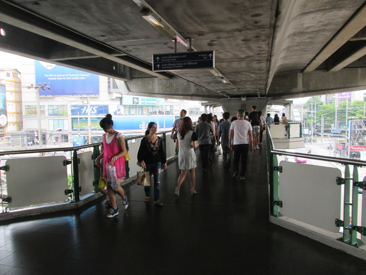 歩きやすくて便利な通路であるため利用者が多いです。地上の道路はコンディションは悪いですが、スカイウォークは床の凹凸はなく、緩やかに上ったり、下ったりしてくれるので、キャスター用の旅行カバンを転がしながら比較的楽に移動できました。