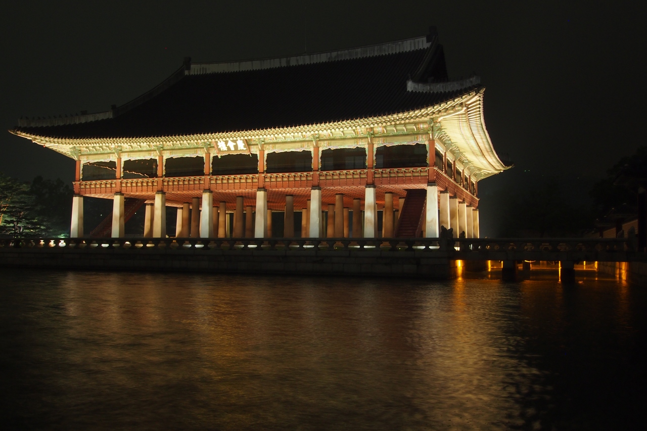 景福宮の夜の特別公開に合わせて写真を撮りに行きました。周りを取り囲む池に映り込む建物狙いです。昼の池は緑色で映り込みがなかなか厳しかったものですから。タイのアユタヤ・バンパイン離宮をイメージして行ったのですけれど、ライトアップ自体があまり明るくなかったので期待ほどには輝かず、さらには風があって水面に波が立つはで、結局計画倒れでありました。なお、池の周囲は低い位置に転落防止のチェーンが設置されいるところがあります。あまり明るくありませんから、写真を撮る場所を夢中になって探していると足を引っ掛ける恐れがあります。自分がそうでした。お気をつけください。