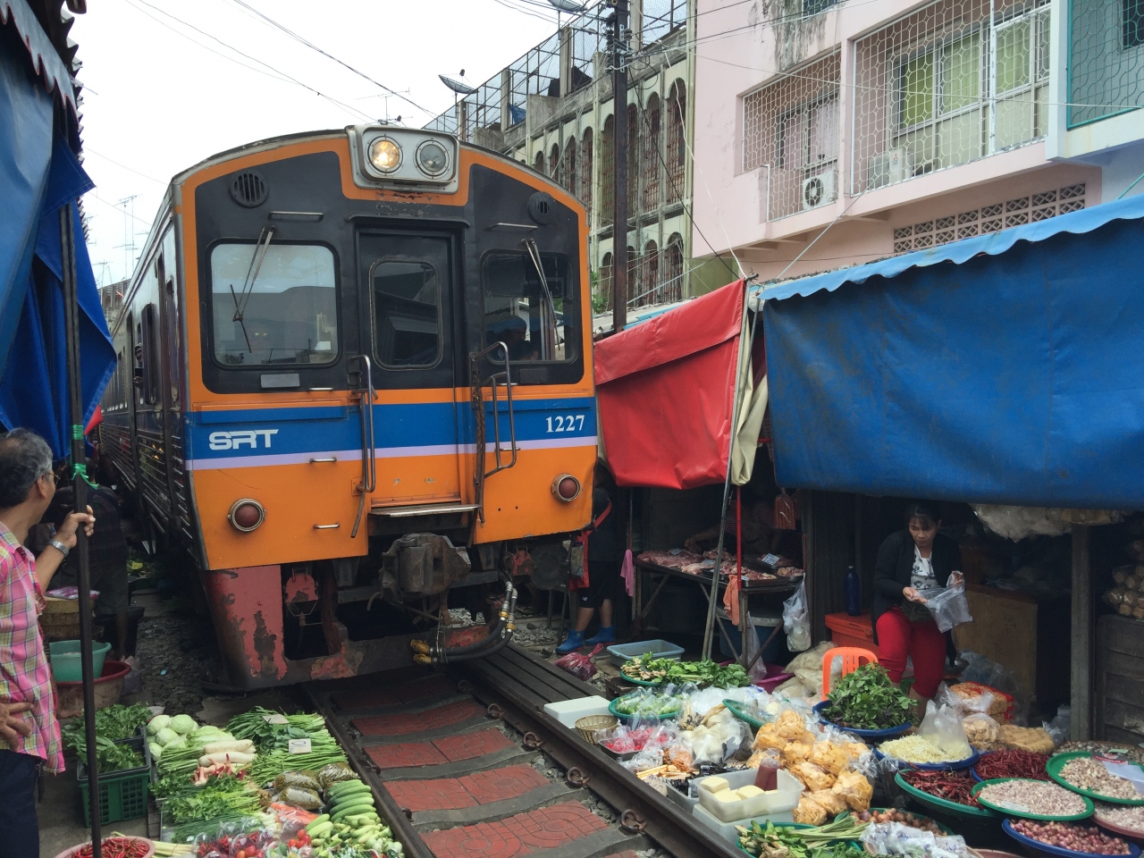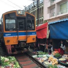 バンコクから半日で行って見ることができます。乗り合いのバンでバンコクから1時間20分くらいです。鉄道が通り過ぎるときは大迫力です。とっても面白い体験ができました。マーケット自体は地元向けなので、観光客が買うようなものはあまりありません。