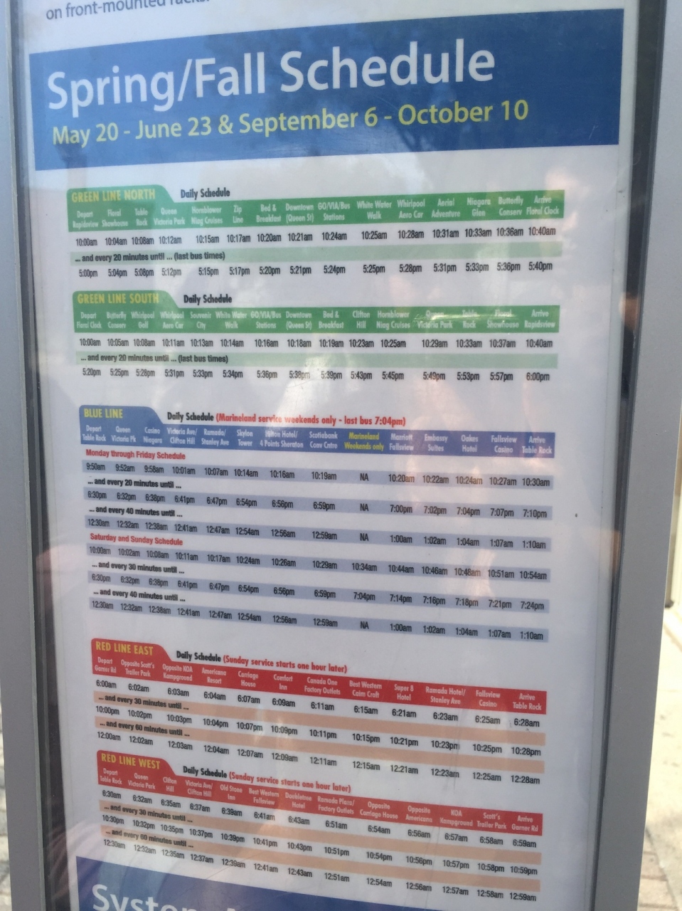 9月に訪れましたが、この時期はナイアガラの滝周辺からバスターミナルに戻ってくるWEGOの路線が夕方頃に終わってしまっていたので、夜ライトアップを見たあとはタクシーでバスターミナルまで戻ってきました。流しのタクシーが走っているので、バスターミナルの方向に歩きながらつかまえることができました。