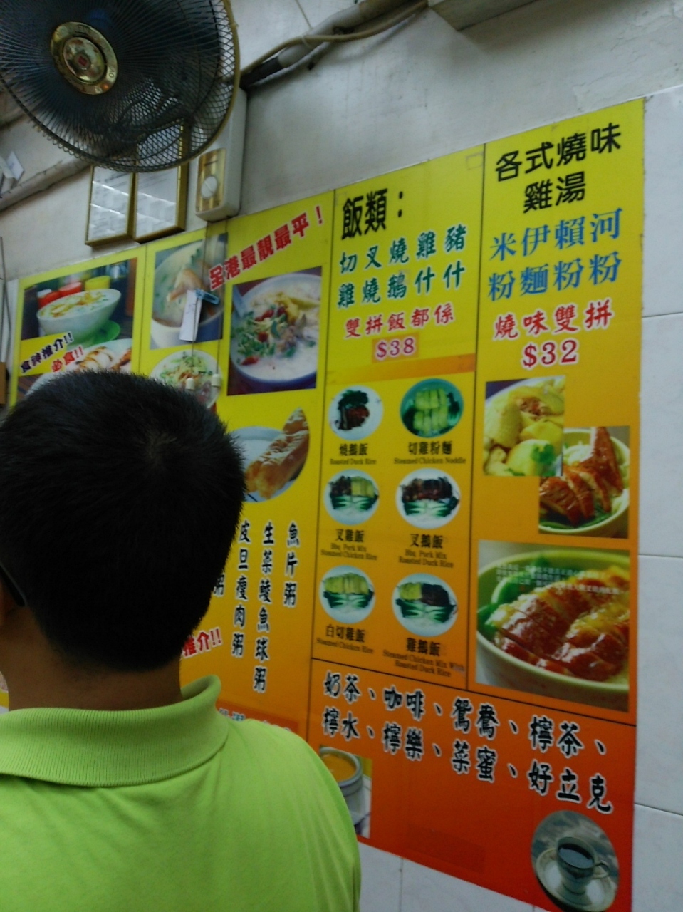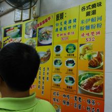 数種類のお粥と海南ライスのような鶏肉を乗せたご飯がメニュー表にあります。ちょっとした炒め物もありましたが種類はありません。
