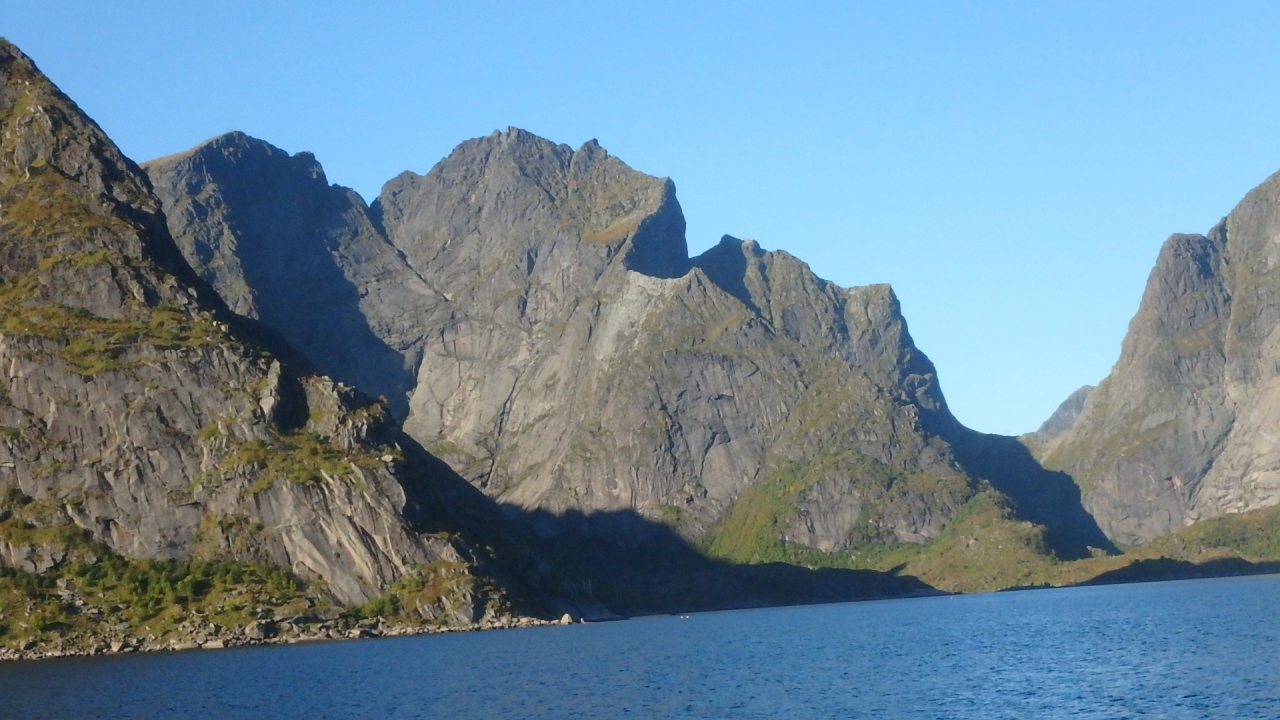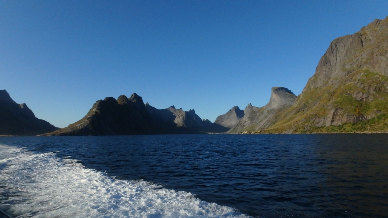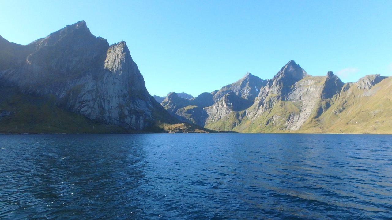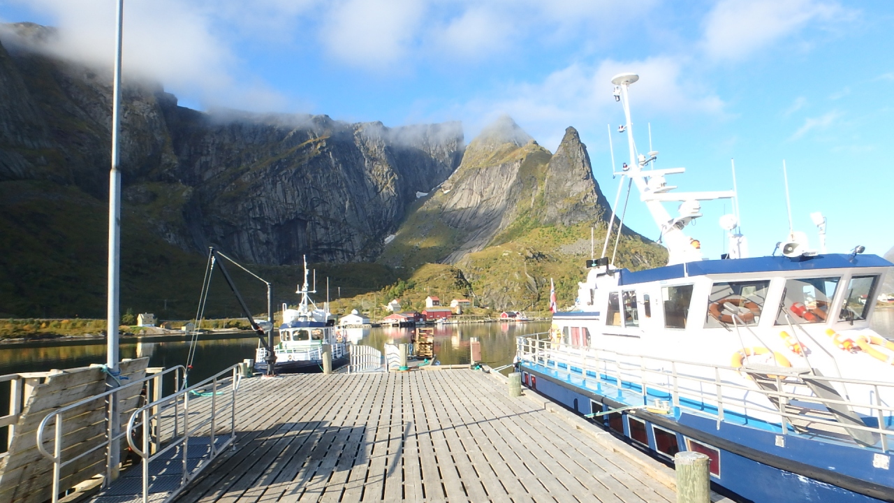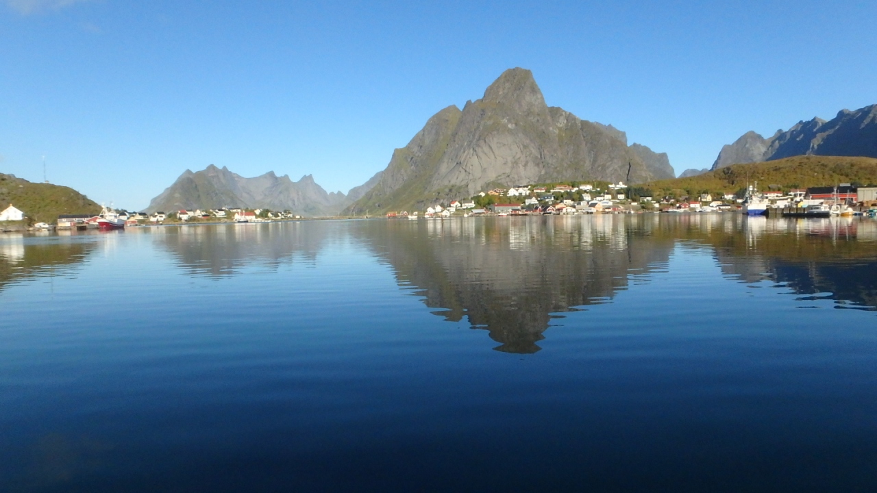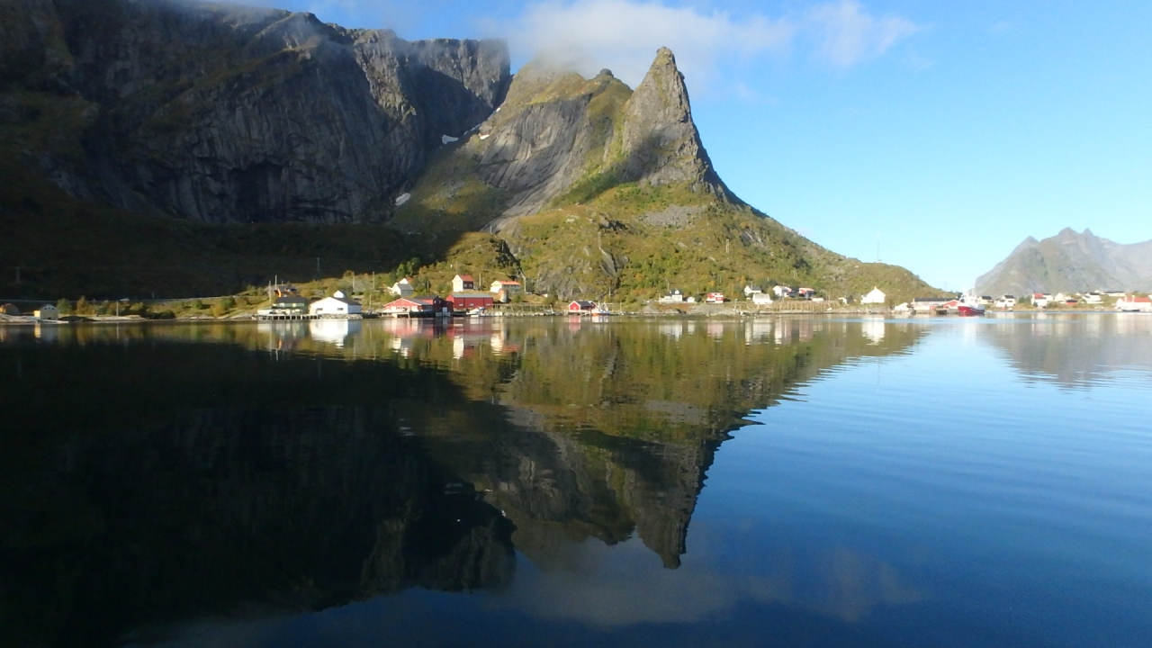 港の中は殆ど波がなく、鏡のような海面には尖った山々が映っていました。