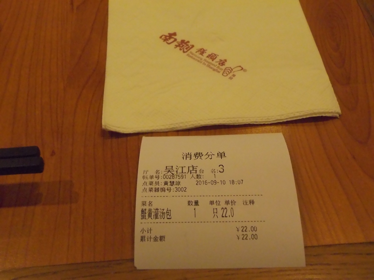 あまりお腹も空いていなかったのと、周りの一人客(ご婦人)も小龍包1籠だったので、蟹黄灌?包を一つ頼みました。(小龍包1籠とさほど値段は変りません)
