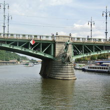 パジースカ通りからヴルダヴァ川を渡る橋で、パジースカ通りの両脇の建物のように、この橋もアールヌーボーの装飾で飾られています。欄干のアイアンワークや橋脚の女性像が優美で、とても美しい橋です。電球が取り付けられているのでライトアップされるのだと思います。夜の橋もきれいでしょうね。