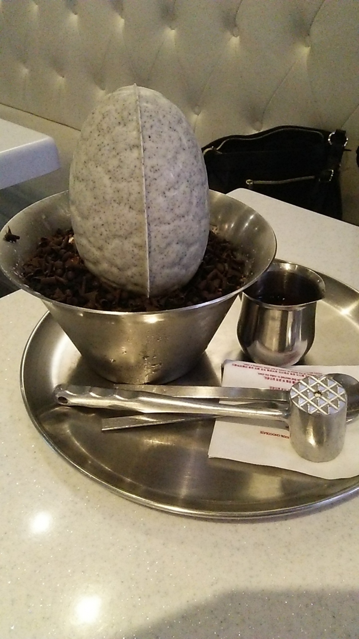 恐竜の卵ピンスはハンマーて割り、チョコをかけてたべるのですがチョコレートカフェなのでチョコの味も良く見た目も楽しかったです。