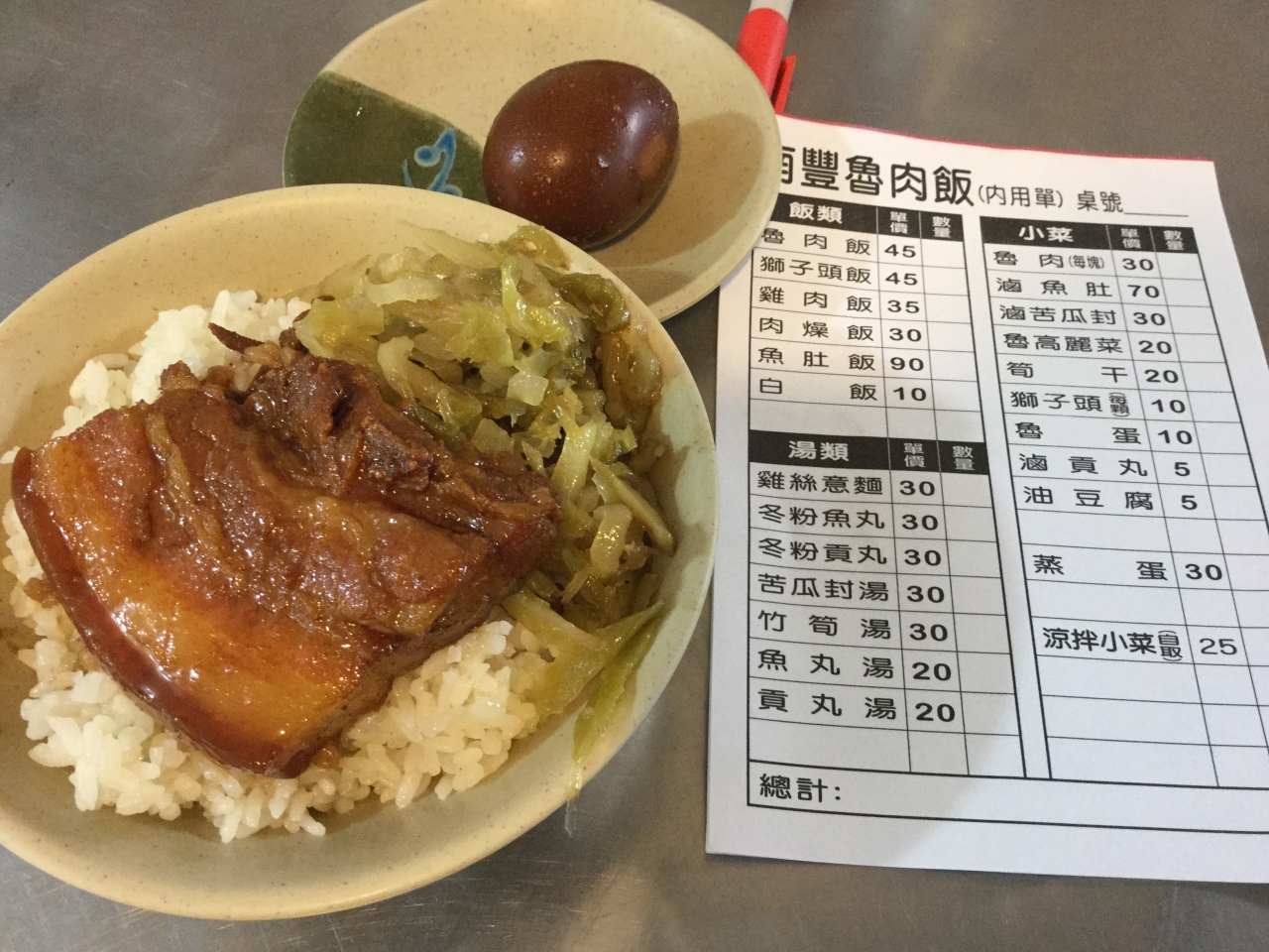 台北で出されるそぼろご飯の魯肉飯と違い沖縄のラフテー(豚肉の角煮)が高雄の魯肉飯では乗っかります V(^_^)V このラフテーが旨いこと!この豚肉の角煮(魯肉)だけの注文(@30元、100円くらい)も可能で、魯肉飯(45元)+魯肉(30元)で豚肉の角煮ダブルの魯肉飯なんて贅沢な注文も可能です。私はトッピングは魯蛋(煮卵) 10元(30円くらい)にしました。
