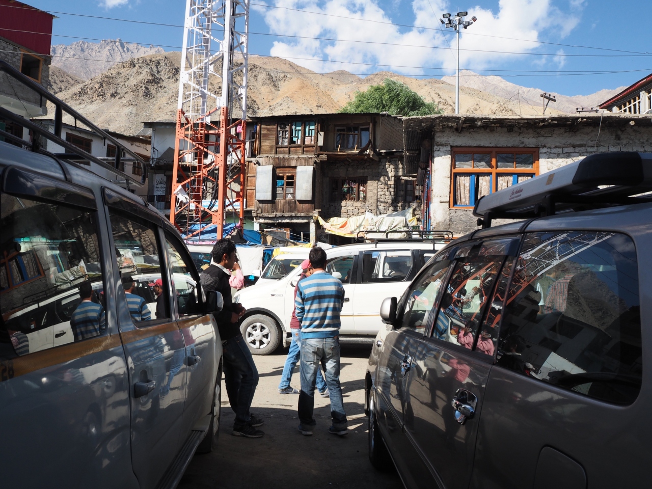 レーのシェアタクシースタンドから、レやスリナガル行きのシェアタクシーが出発する。