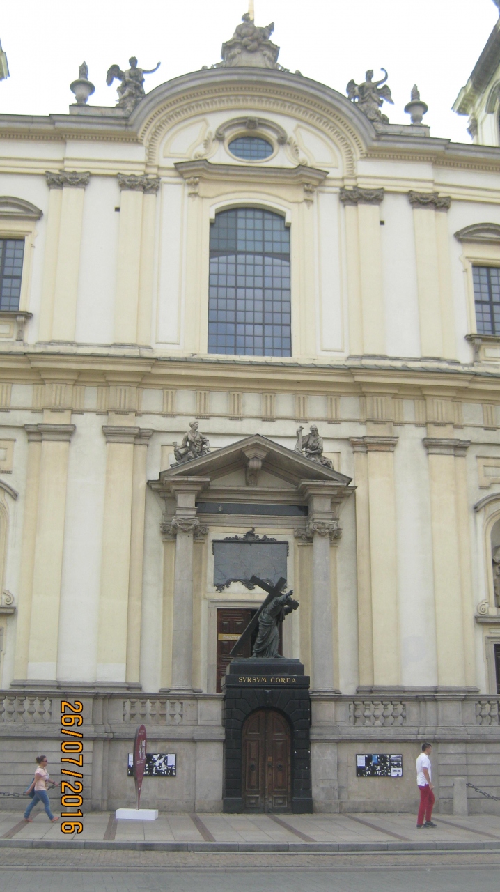 ワルシャワの新市街地のメインストリートの一つの新世界通りに面しています。大きな教会でルネッサンス様式の建物です。教会内は白を基調としているので明るく感じます。金箔の装飾されたものが全体にあります。バロックの世界です。この教会の柱の下にショパンの心臓が生まれれています。