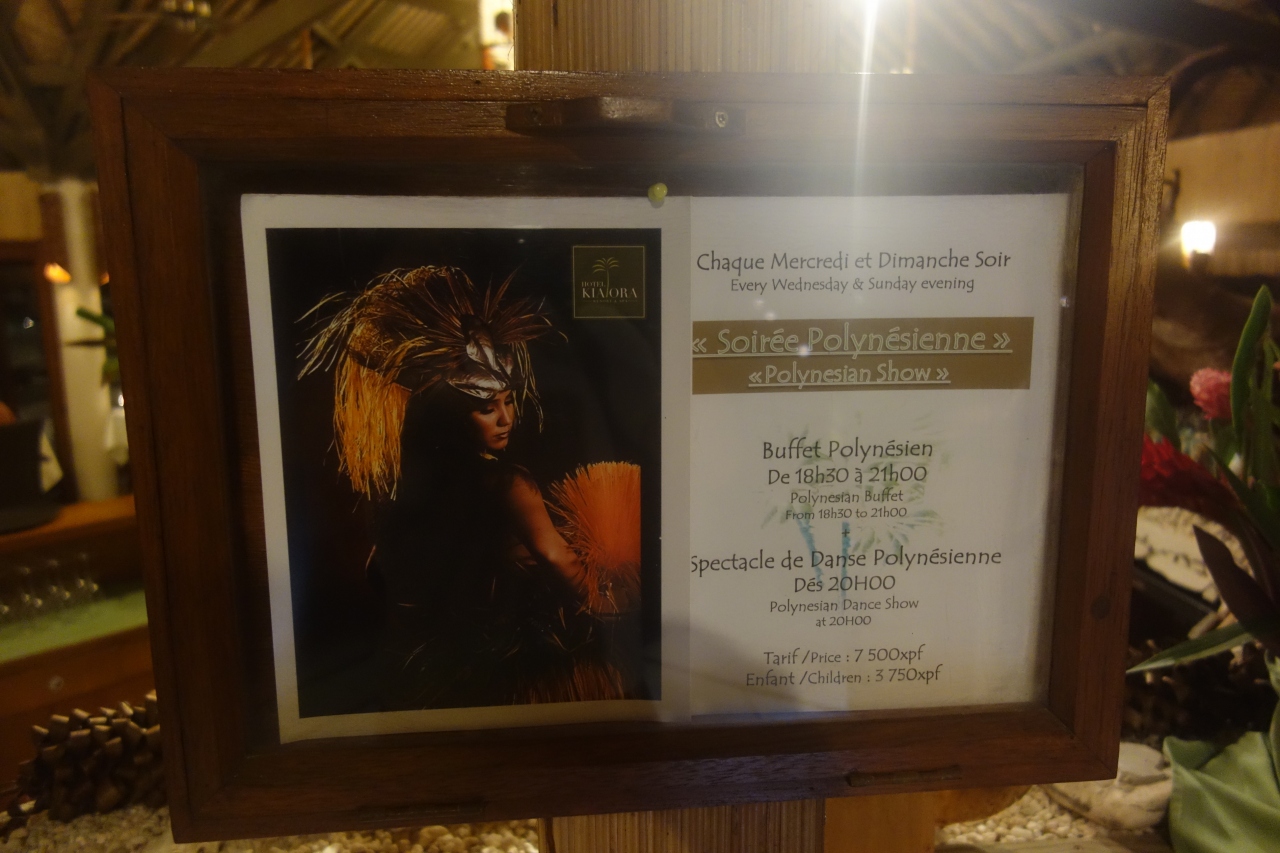 ビール、グラスワインに、メインのみ1品オーダー。パンが付いて、税・サービス料込みで、お代は 6,060 CFP(≒6,000円)でしたが、これに前菜とデザートを追加したら、1万円は超えるでしょう。まあ、タヒチの高級リゾート内のメインダイニングと思えばこんなものかもしれませんが、ちょっと寂しい水準かも・・・
