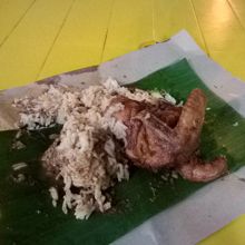 行列のできるナシククス屋。1年2ヶ月ぶりの再訪です。おかずは各種揃っていますが今回もアヤムゴレンとナシをオーダー。このセットで5.5RM。残念ながら前回より0.5RM値上がっていました。前回はモモ肉でしたが今回は雛鳥のハーフ、見た目もごつくボリューム満点。テイクアウトもできますがもちろん店でも食べられます。屋外のテントの下にイスとテーブルが並べられています。もちろん手で食べます。カリカリに揚がった肉は中はふっくら、かなりおいしいです。私はご飯1カップでちょうどいい量でしたがガッツり食べたい方は2カップでもいけると思います。飲み物も各種揃っていますのでお好みでどうぞ。