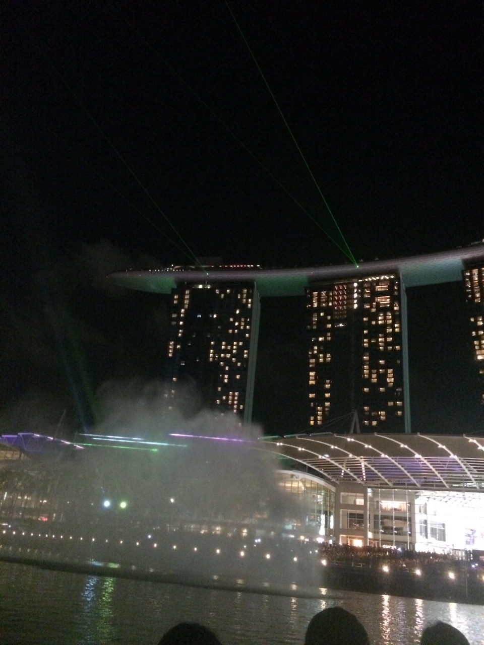 19時30分くらいに船に乗りました。船の後ろの左サイドに座っていると、マーライオンが綺麗に見えます。マリーナベイサウンズの建物から様々な色の光と噴水が音楽に合わせて繰り広げられます。花火と違って、天気に左右されないので、雨でも楽しめるのかもしれません。