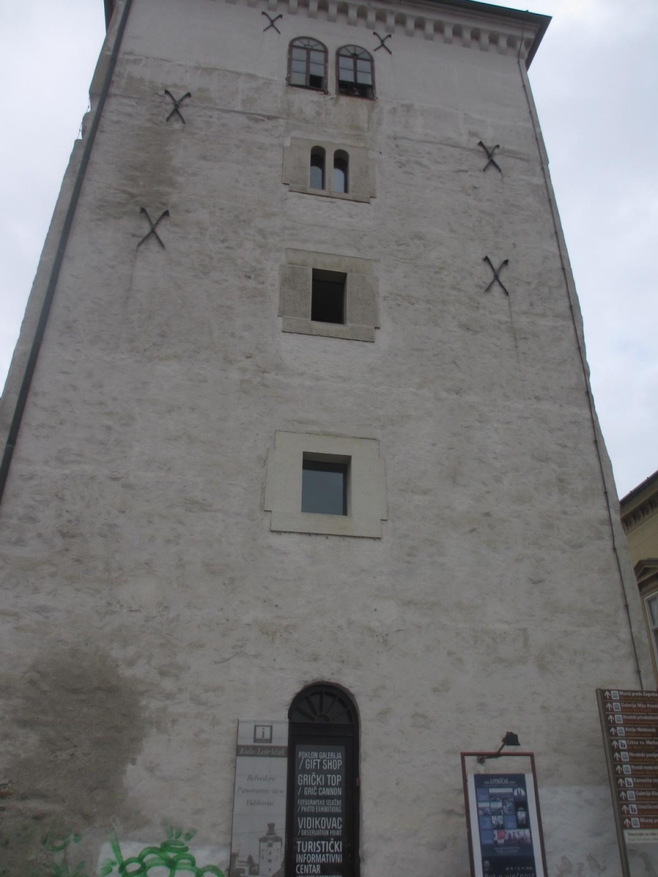 ザグレブ旧市街でケーブルカーで登って降りたすぐ前にある塔です。聖マルコ教会から行く場合は、教会から南に進んでいけば突き当りの右手です。正午に号砲がなるそうですが、私が行ったのは14時過ぎだったので残念ながら聞くことはできませんでした。有料ですが塔の上に登れます。建物はそんなに高さはないのですが元々が高台にあるのでザグレブ市街の風景を見渡すことができました。