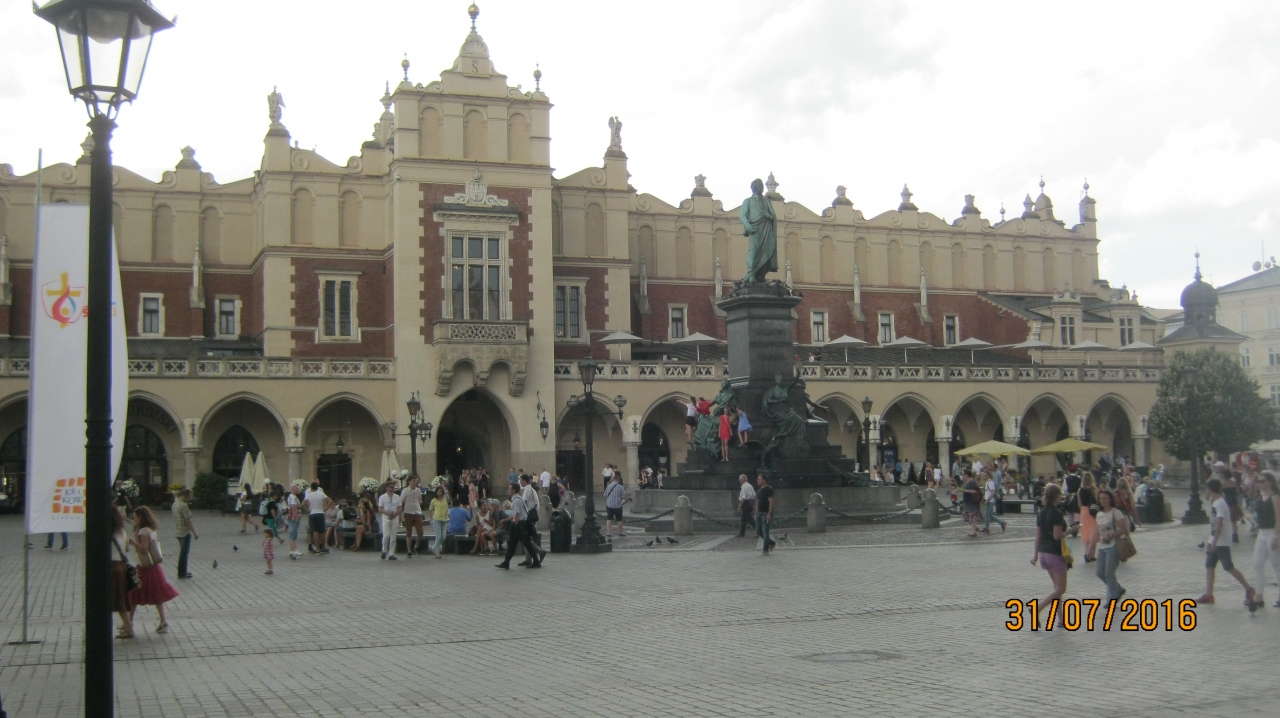 中世からの広場ではヨーロッパ最大の広さのようです。広場の中央には織物会館の建物があります。また西南には旧市街地の塔が、そして東南には聖ヴォイチェフ教会が、さらに東にはアダム・ミツキエヴィッチの像があります。周りにはルネッサンス様式の建物と聖マリア教会です。その光景は目をみはります。