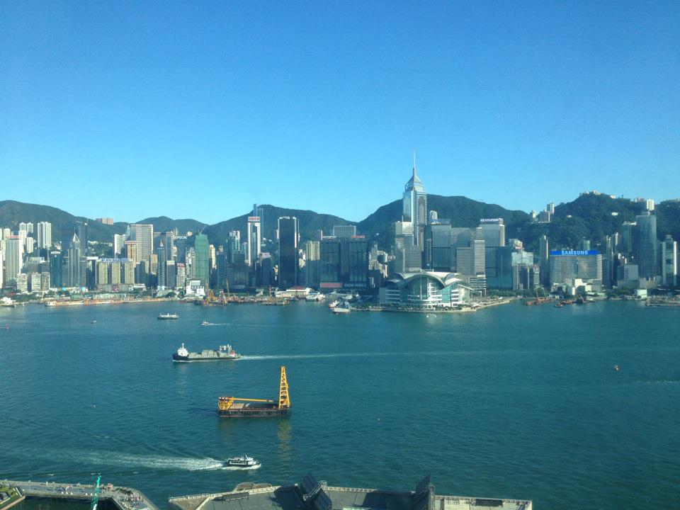 ディナー前の小一時間を利用してバーで一息つきました。なんといっても高層階からの眺めはとても良く、もちろんネオンの美しいディナータイムもよいのですが、今回は夕陽の照らす香港島を眺めながらお酒をいただきました。1人2杯ずつ飲んでもテーブルチャージを入れて1人3,000円程で、雰囲気もよく楽しめました。お勧めです。