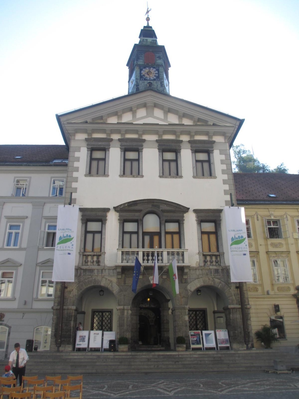 リュブリャーナ旧市街、三本橋から南東に進むと突き当たりに市庁舎はあります。時計台に目を引かれました。日本の市役所は無味乾燥だけれど金はかかっているような建物が多いですが、こちらの建物はヨーロッパらしく味わいがありました。