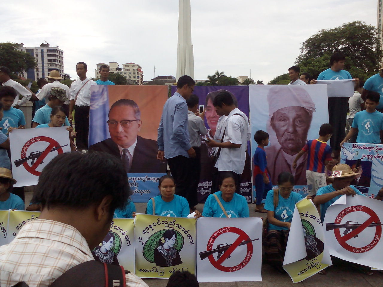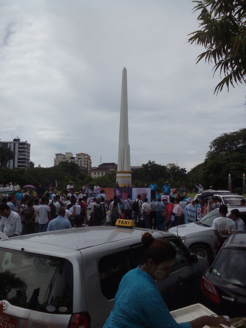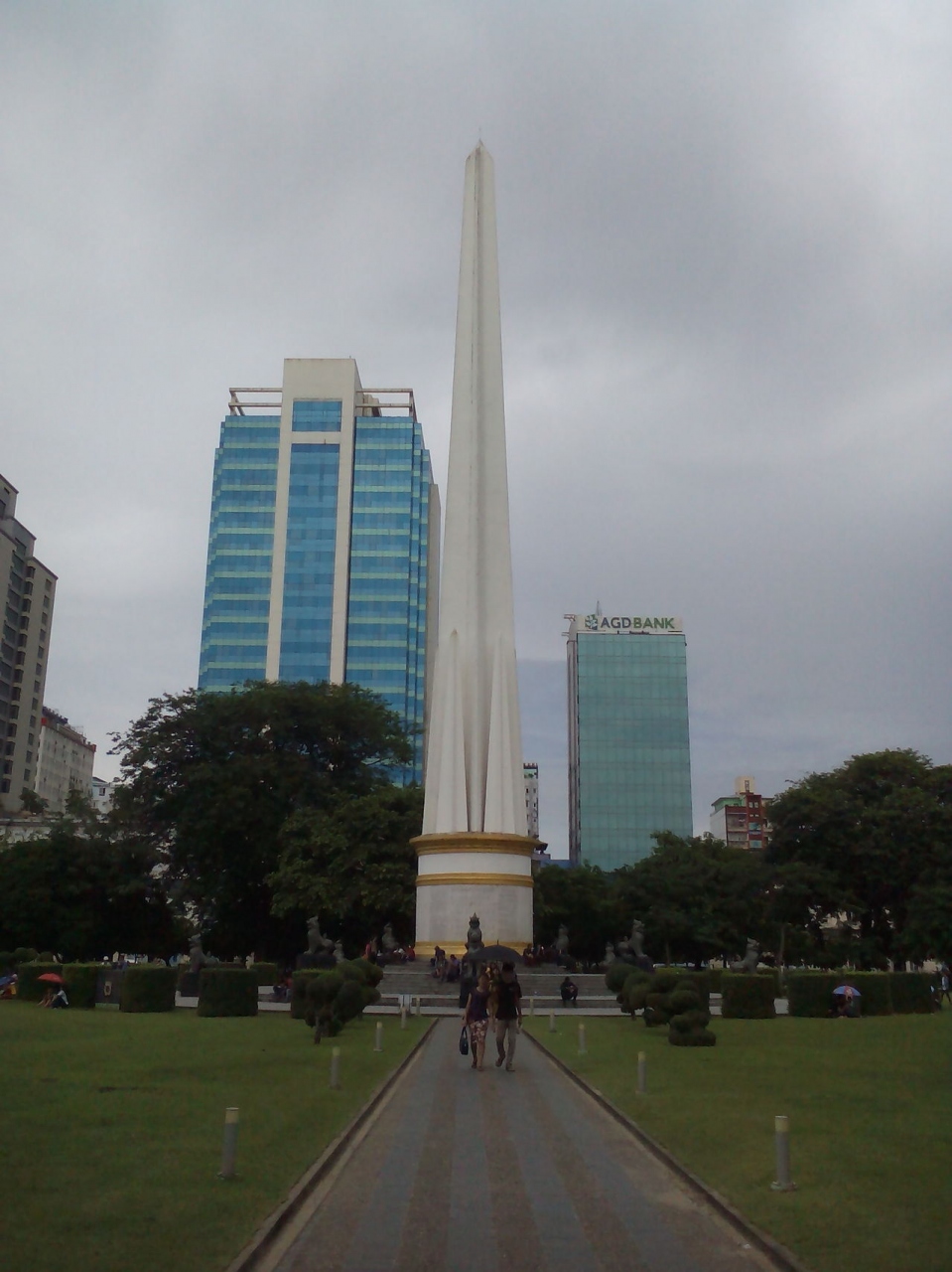 独立記念塔は、ヤンゴンのダウンタウンの中心にあるマハーバンドゥーラ公園の中心にそびえています。周辺にはスーレーパゴダ、市庁などがあり、見所が集中した地域でもあります。公園前のスペースではよく集会が行われており、ミャンマーの民主化を感じさせます。