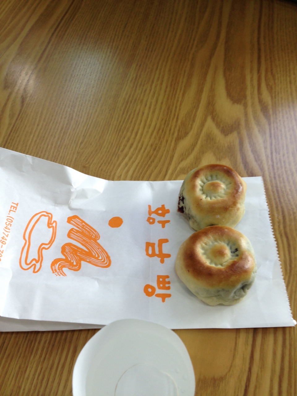 店中では買ったばかりを食べることのできるベンチと紙コップで水などいただける場所があり、数名のアジュンマ連が食べていたので、我々もジョイン。