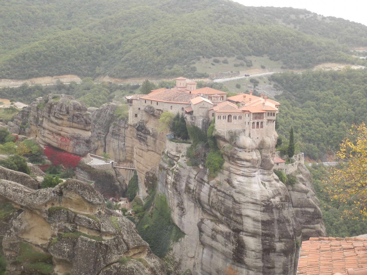 メガロメテオロン修道院から下って歩いていくと、ヴァルラーム修道院が見えてくる。距離はそんなに遠くないので歩いて回れる。この修道院は切り立った岩に建てられていて景観もすごい。教会の壁画も見ごたえあるし、荷物の運搬に使われた滑車なども見られる。