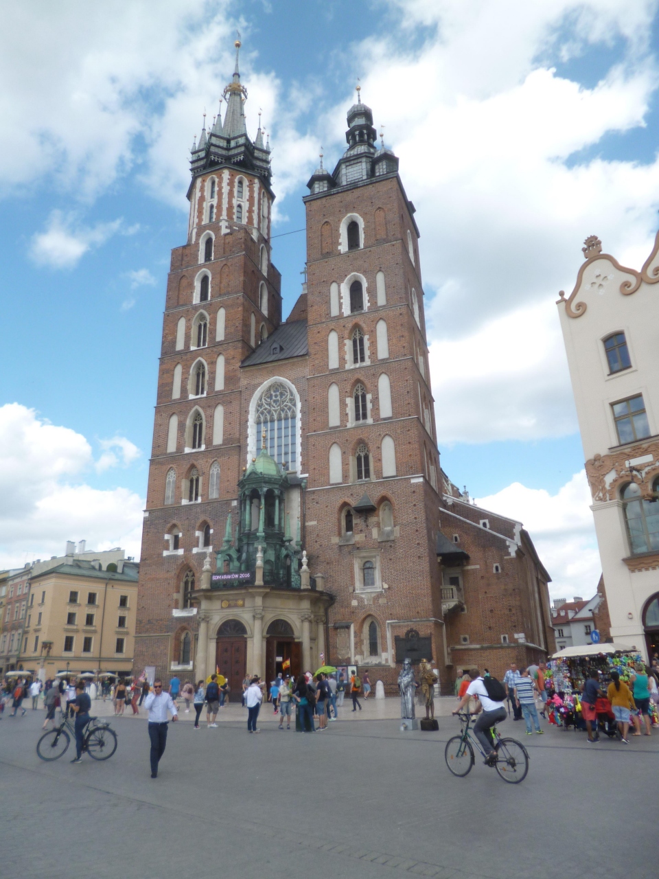 クラクフの中央市場に面して建つ、二本の尖塔をいただく教会がマリア教会。塔のデザインが左右で異なる教会はままありますが、まったく違うデザインの教会はあまりみないです。ちょっとアンバランスに思いますが。