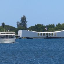 パールハーバーの海上にある白い建物がアリゾナ記念館で、ランチボートで向います。