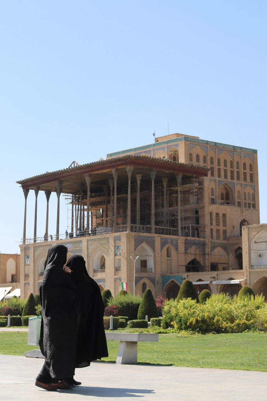 2階のテラスからは絶景が見渡せます。ただちょうど工事中だったのが残念。かつてのシャーのようにここからエマーム広場を一望の下に見渡せたらどんなに気持ちよかったか。このテラスの壁にはイスラム圏では珍しい女性の細密画も描かれていました。