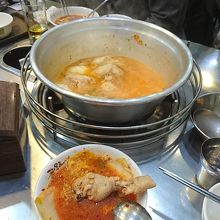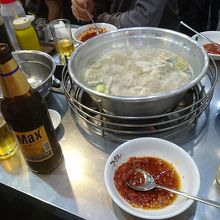 着席すると、既に調理済みの鍋が運ばれてきて、火にかけます。鶏はお店の人が鋏で来てくれますので、茹るのを待って間に自分好みにタレを調合します。
