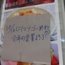 11時頃行ったら、入口のところに10/16に(マンゴー終わり)今年の営業終了の貼り紙がされてました。
