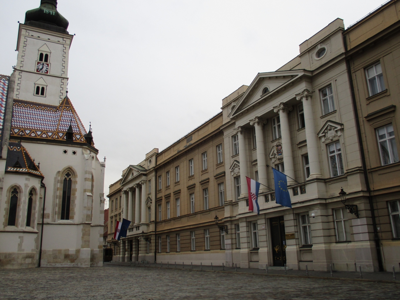 ロトルシュチャク塔から北へ直進すると、スヴェティ・マルコ広場に着きます。この広場は、聖マルコ教会をはさんで、首相官邸と国会議事堂が向かうように建っています。国会議事堂は、パルテノン神殿のような白い建物と茶色の建物が交互に並ぶ風格ある建物です。