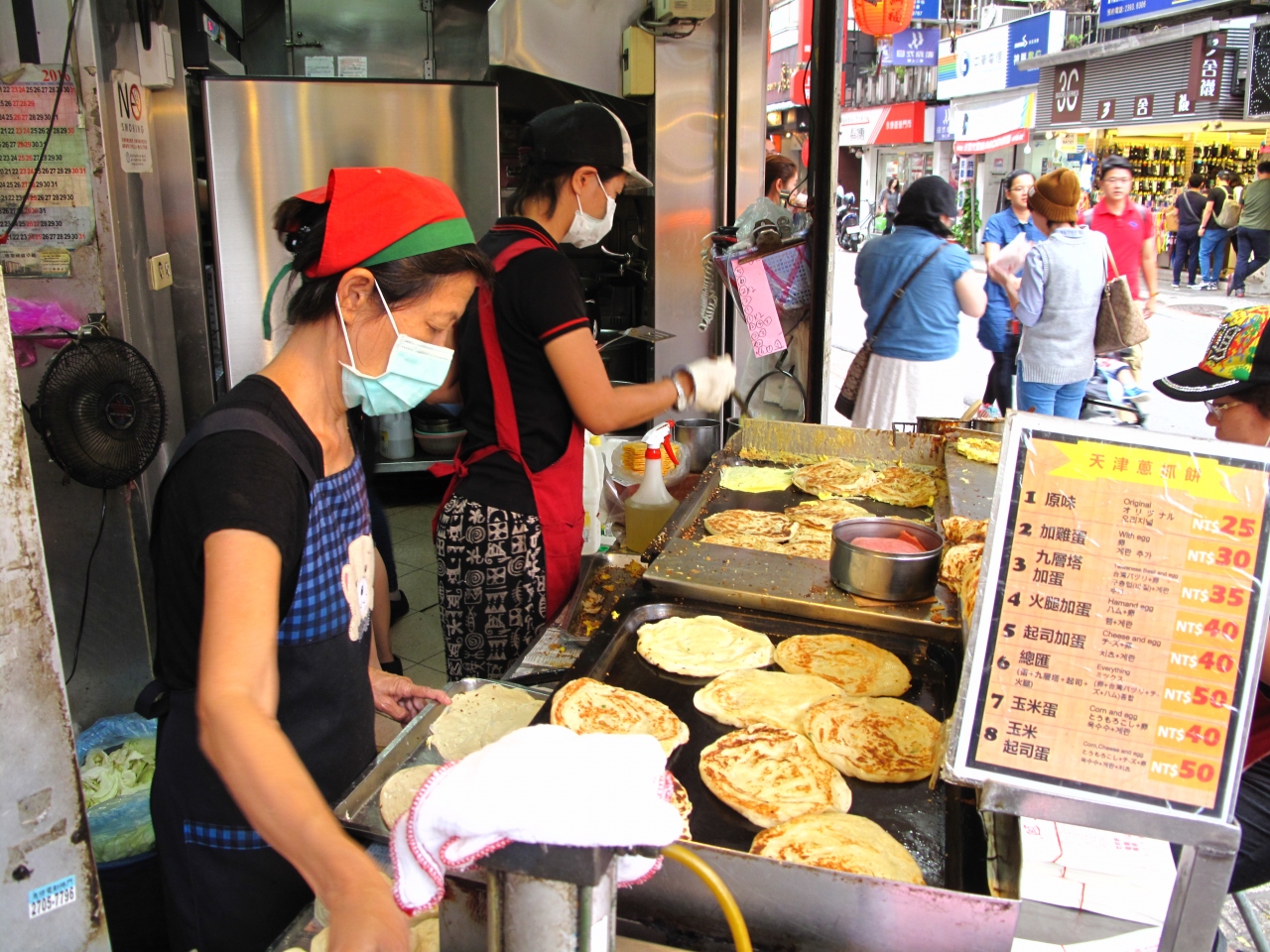 並んでいる間にメニューをもった店員さんが注文を取りに来ます。卵入りが人気のようにみえました。原味(プレーン)をどんどん焼いていき、仕上げに溶き卵や中国バジルなどを注文通りにからめて渡してくれます。