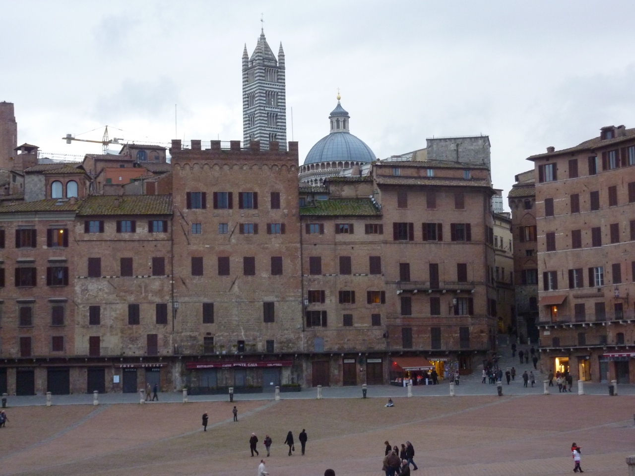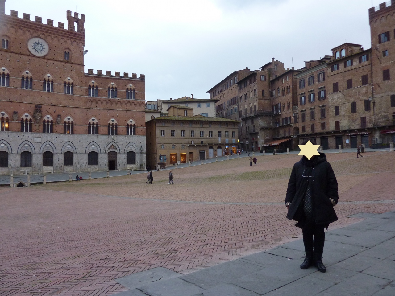 3つの丘が合流する窪地に扇状に設けられた広場で、中世に作られた最も広い広場の一つ。市庁舎として使われるプッブリコ宮が扇の要の位置にあり、広場の中央上段にガイアの泉が設けられ、レンガ色の広場を区切る白い石の線で当時の有力者の数に9分割されています。広場はかなりの角度になっていて降った雨はブッブリコ宮の前にある穴に入るようになっているみたいです。そのためか、広場を下ると自然と市庁舎に向かって行ってしまいます。